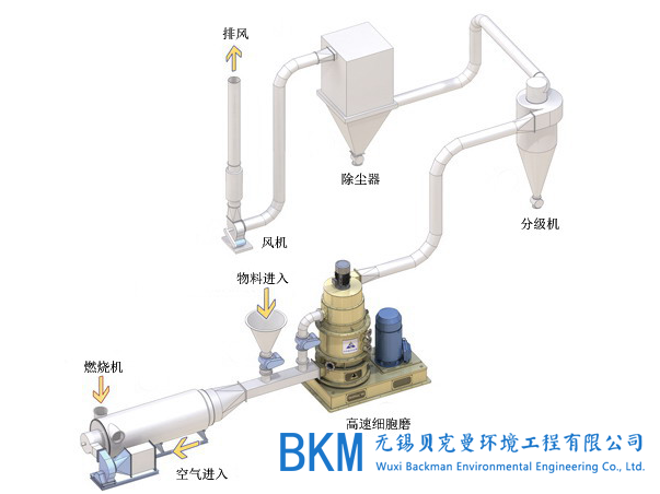 浆料泵进主机后被喂料装置下方进入的高温空气瞬间干燥。物料颗粒一面干燥,一面不断受到高速打散机的粉碎,物料颗粒尺寸不断减少,在热风作用下,细粉及小颗粒物料被带向上方分级装置处,由于分级装置旋转时(转速可调)产生向下的压力和离心力,故颗粒物料被下抛到干燥段内壁,沉降到粉碎装置处继续被粉碎和干燥,已干的细粉通过分级装置由除尘器搜集。